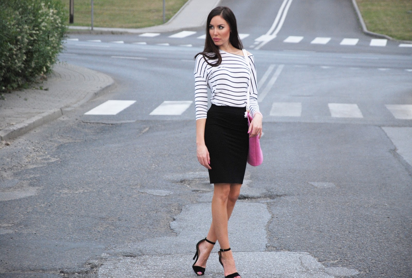 Super stylizacja, różowa torebka fajnie prezentuje się z czernią i bielą <3